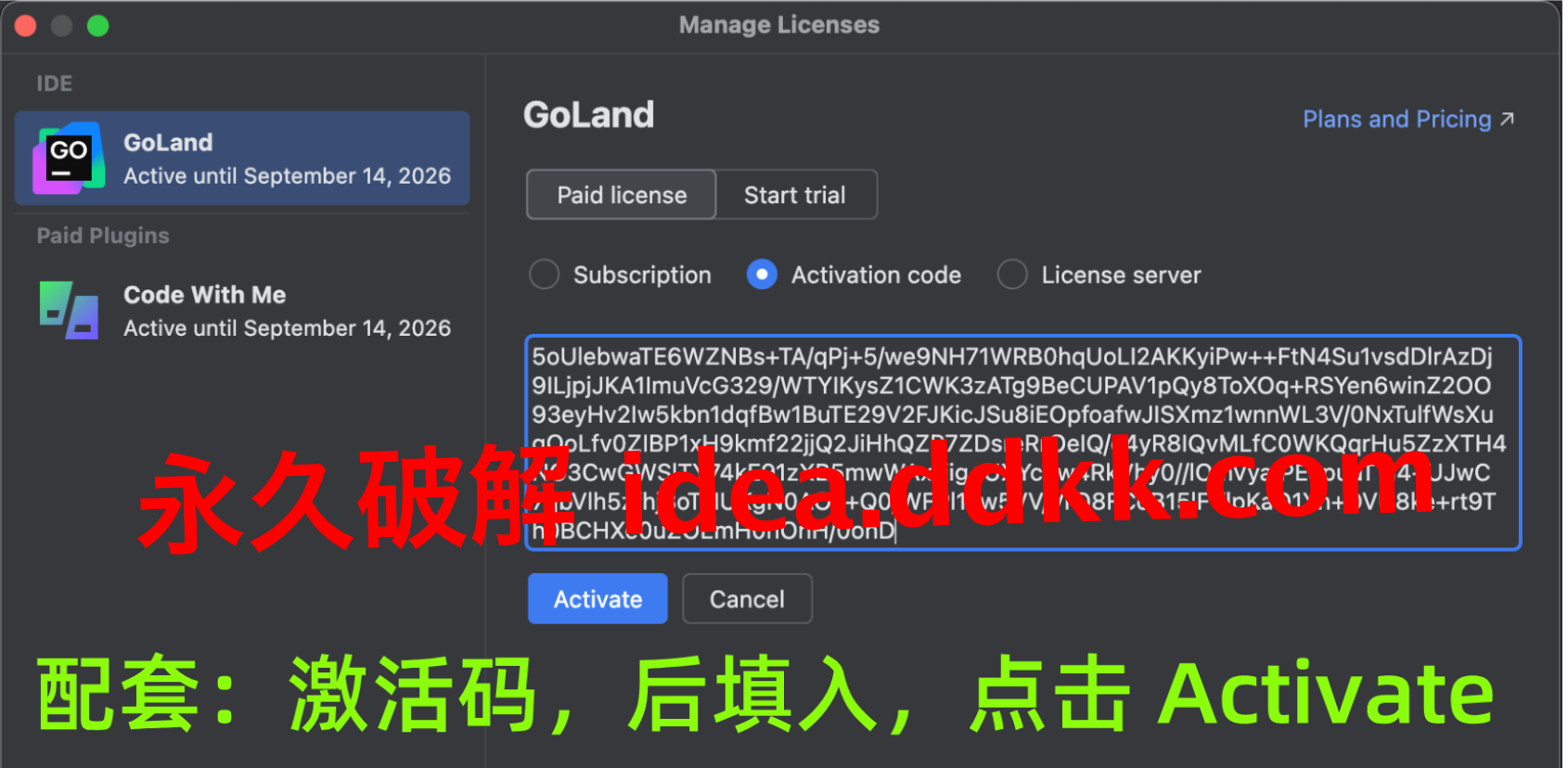 补丁装好之后,就可以打开GoLand输入激活码了。这里要注意,JetBrains每个产品的激活码都不一样,别搞混了。