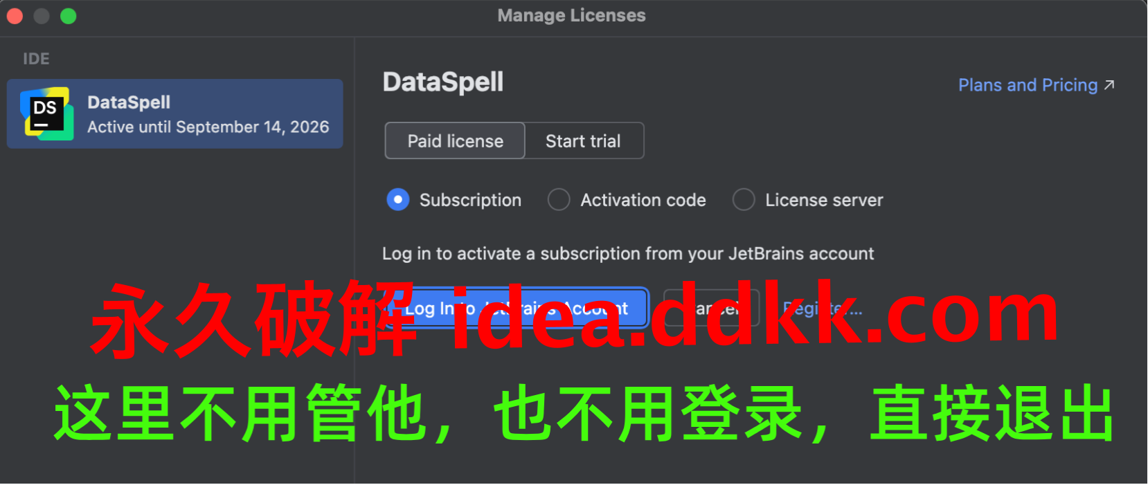 补丁安装完成之后,接下来就是输入激活码了。这里要注意,JetBrains每个产品对应的激活码都不一样,DataSpell有专门的激活码,别用其他产品的激活码,不然会提示Key is invalid。