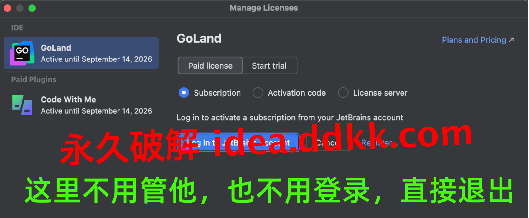 IDE运行成功后,会弹出登录对话框,提示需要先登录JetBrains账号,这时候千万别急着登录