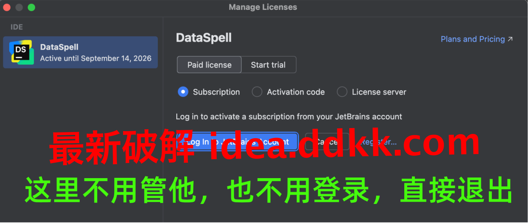 DataSpell 首次启动弹出的账号登录框,找到 Exit,点掉它退出来