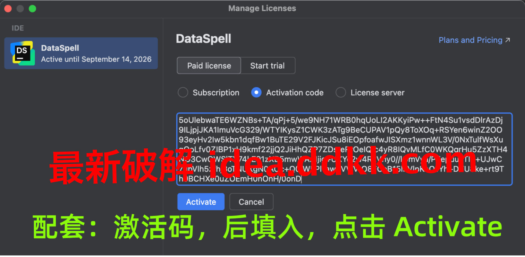 进到激活码输入框,把DataSpell对应的码粘进去,确认,DataSpell重启之后进Help → Register瞅一眼: