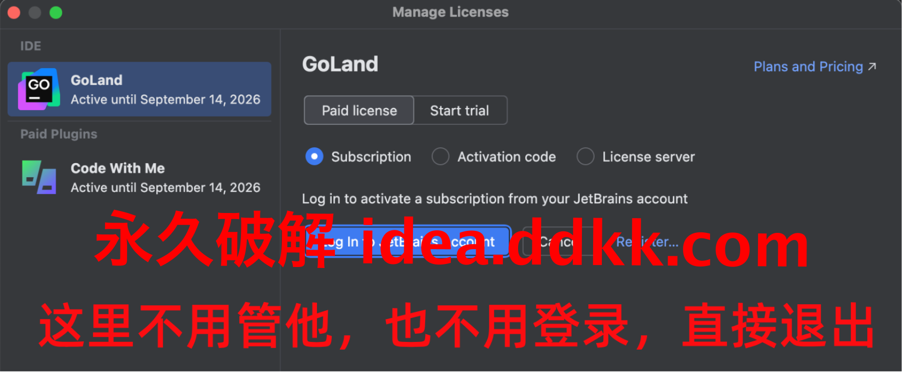 激活码输入这一步,注意别搞错了。每个JetBrains产品对应的激活码都不一样,每个产品都不一样,别混了。GoLand有GoLand的激活码,IDEA有IDEA的激活码。