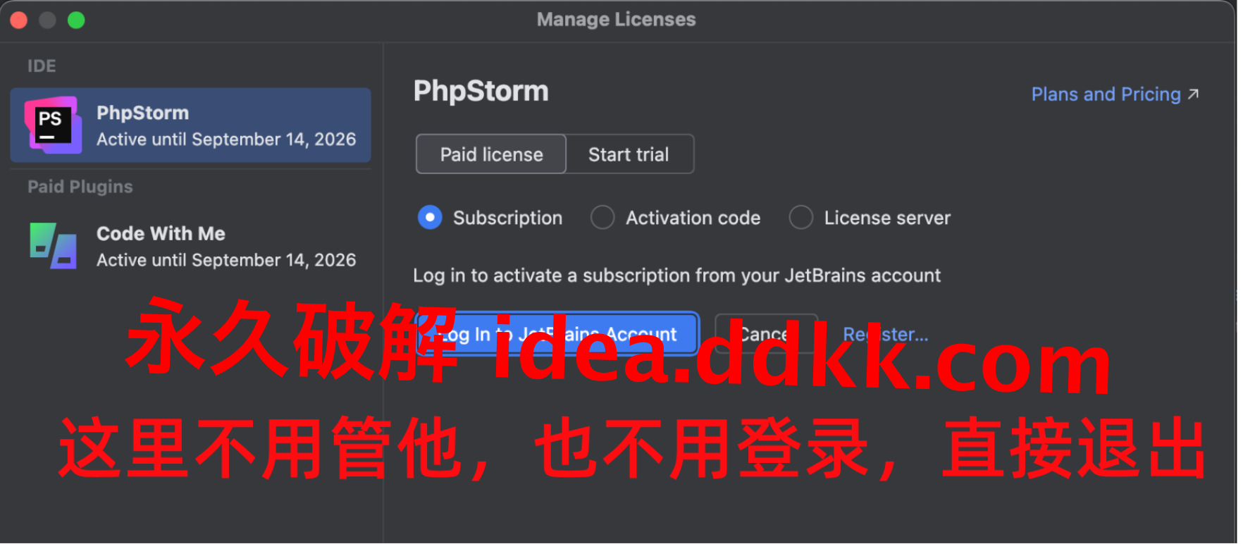 PhpStorm装好之后第一次启动会弹出一个登录界面,让你登录JetBrains账号,这时候千万别急着登录先点退出,因为咱要用破解的方式激活不需要登录账号