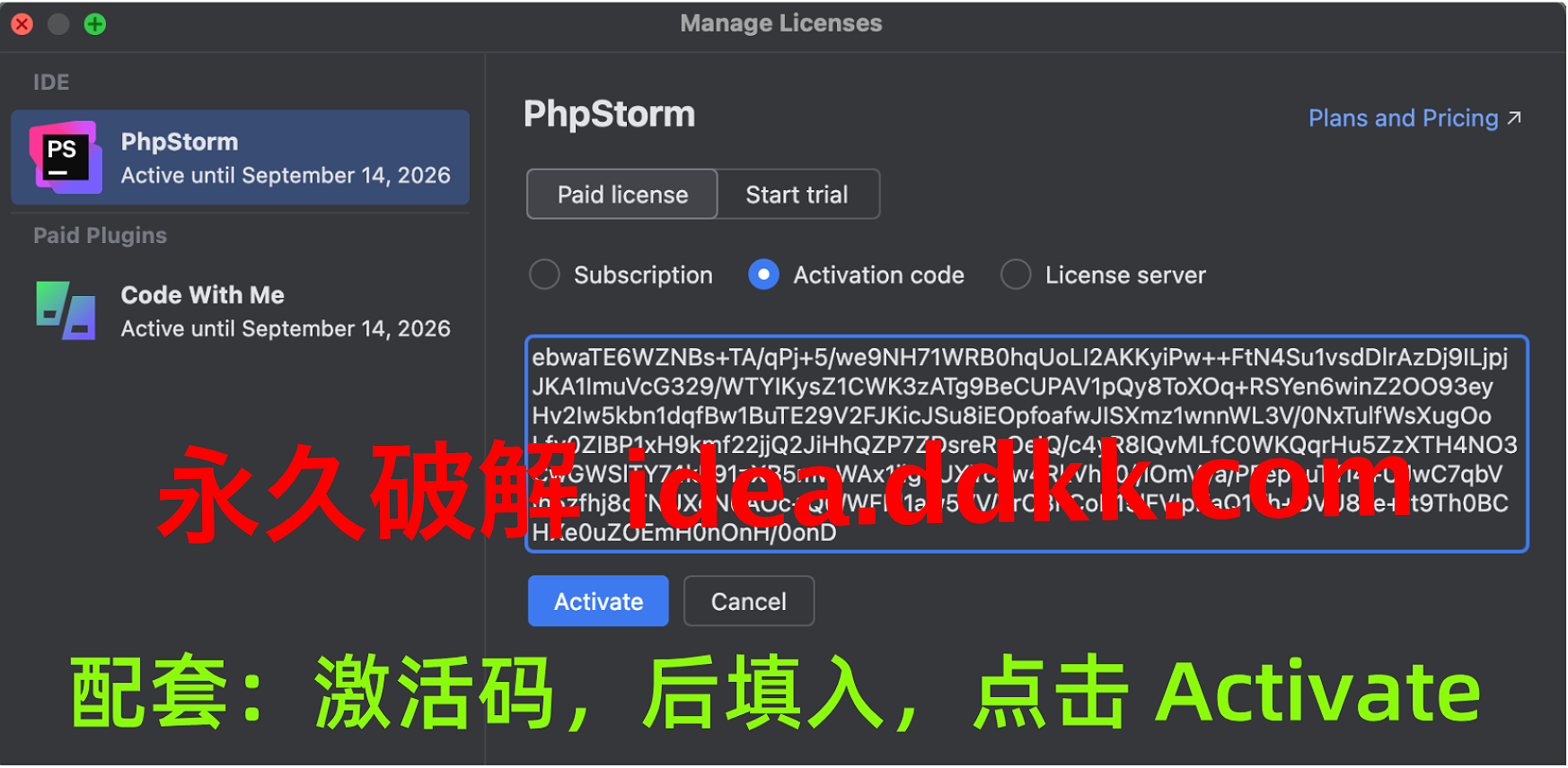 补丁装好之后就可以输入激活码了,我鹏磊提醒一下不同JetBrains产品的激活码是不一样的,PhpStorm有专门的激活码别用错了