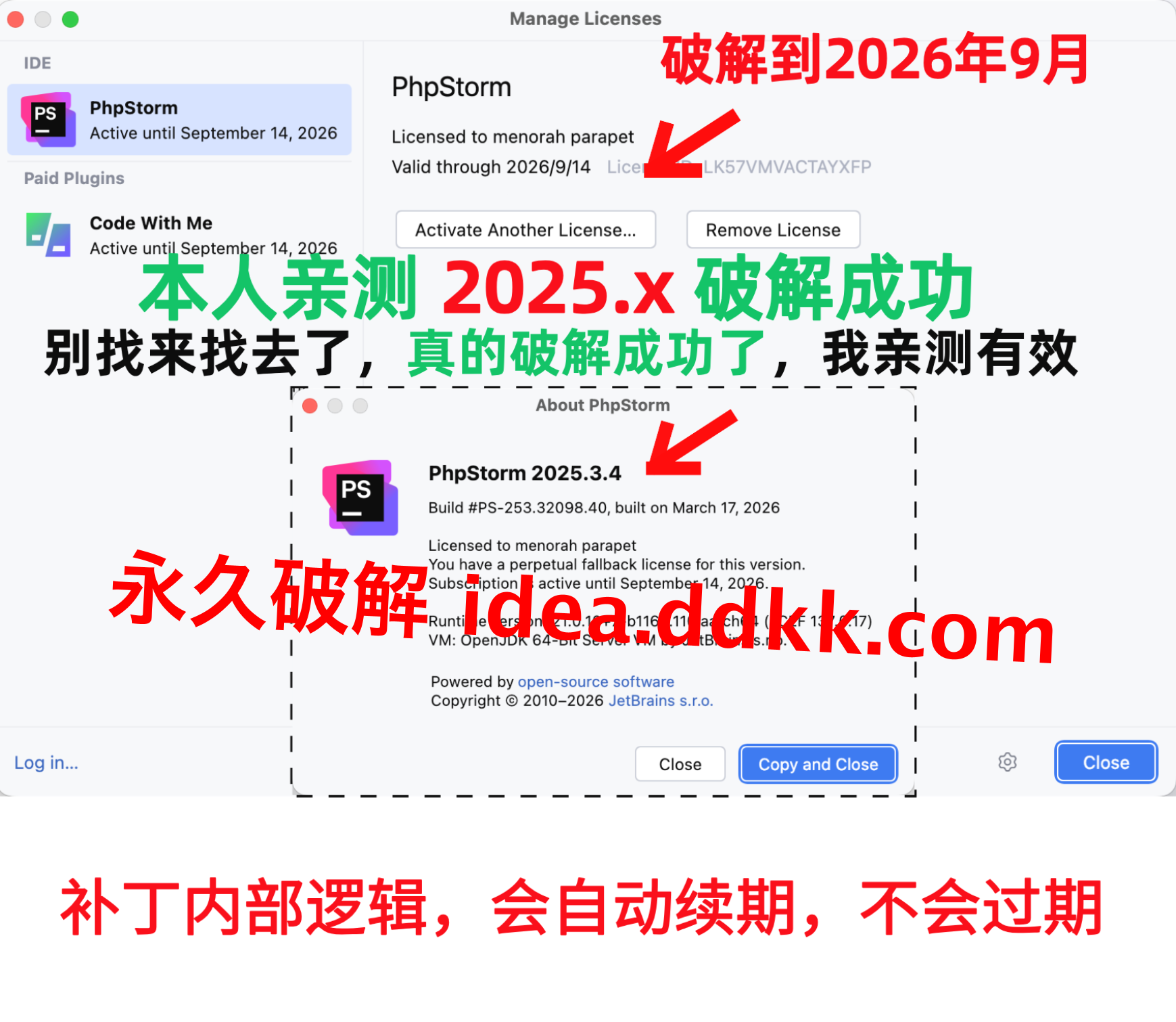 话先说到这里,图先放这里,这是破解完成、打开 PhpStorm 进 Licenses 界面的授权状态,看清楚这个画面,后面做完你也照这个对:
