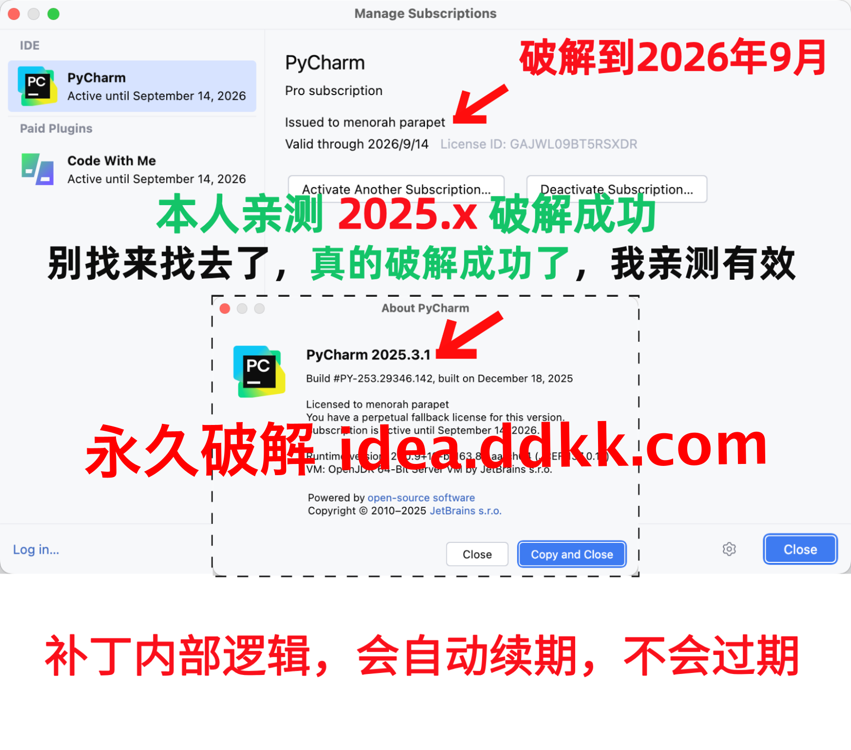 PyCharm 2025.3.1破解补丁安装后,不要移动位置也不要删除,否则激活会失效