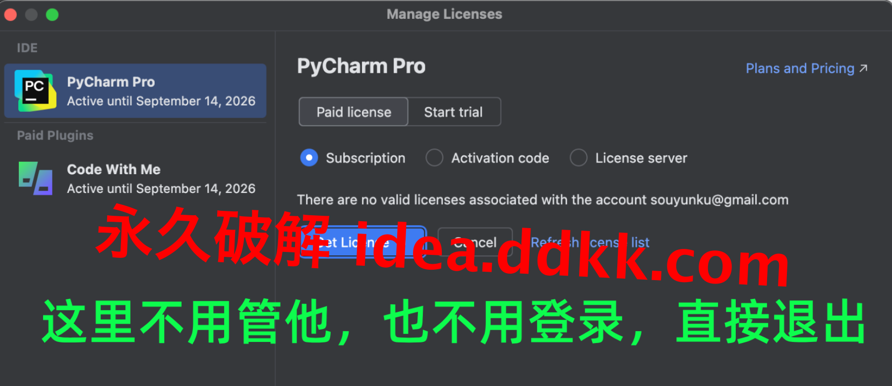说一个每次都有人踩的坑:JetBrains 旗下产品各用各的激活码,PyCharm 对应专属的那条,不能拿 GoLand、WebStorm、DataGrip 的码来凑,填进去只有一个结果——Key is invalid。那个报错不是补丁的锅,是码拿错了。去下面这个链接找 PyCharm 对应的那条: