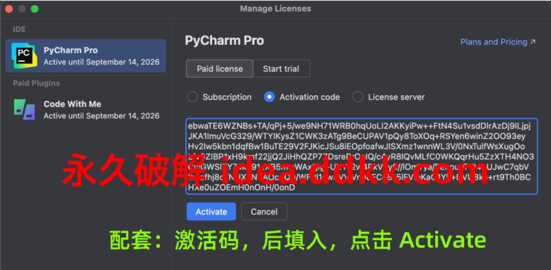 补丁就位,重启 PyCharm,这次不点 Exit,在激活界面把码填进去。