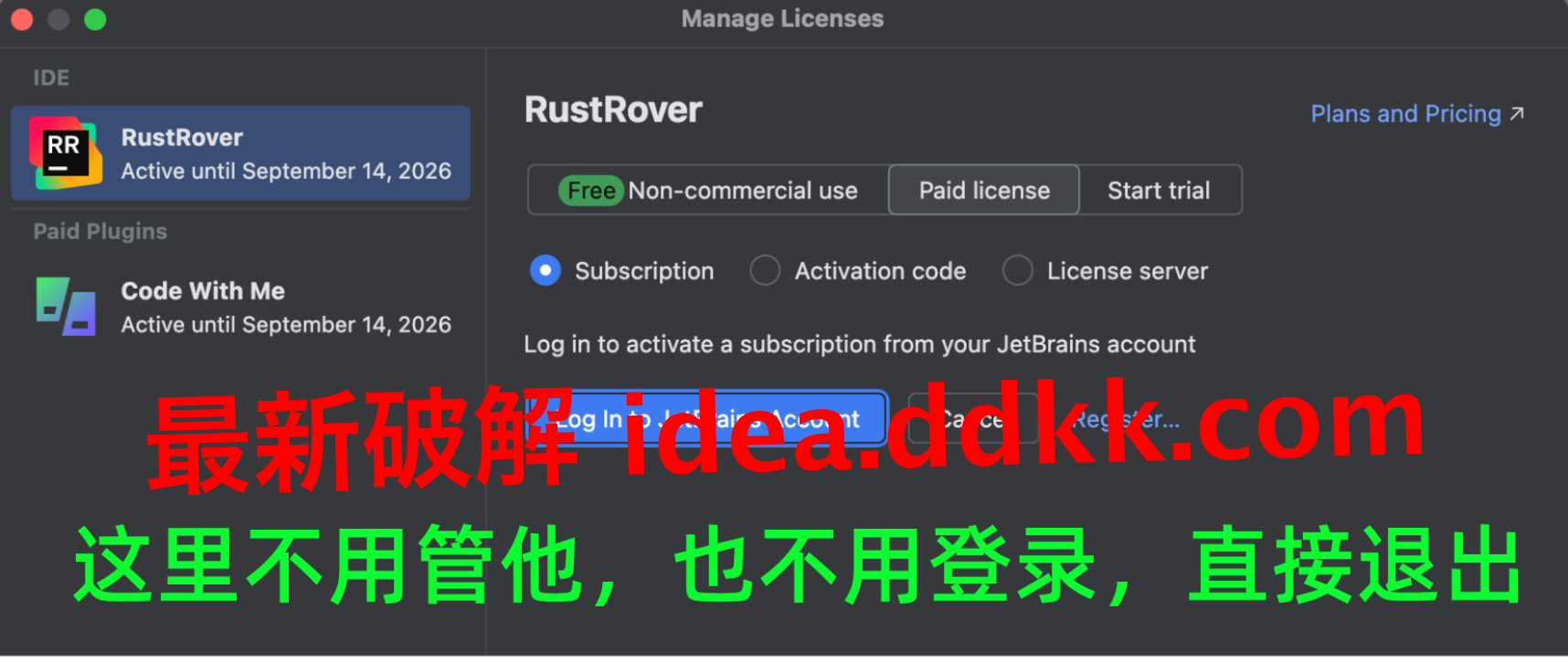 RustRover 启动后弹出登录对话框,别管它,点 Exit 关掉