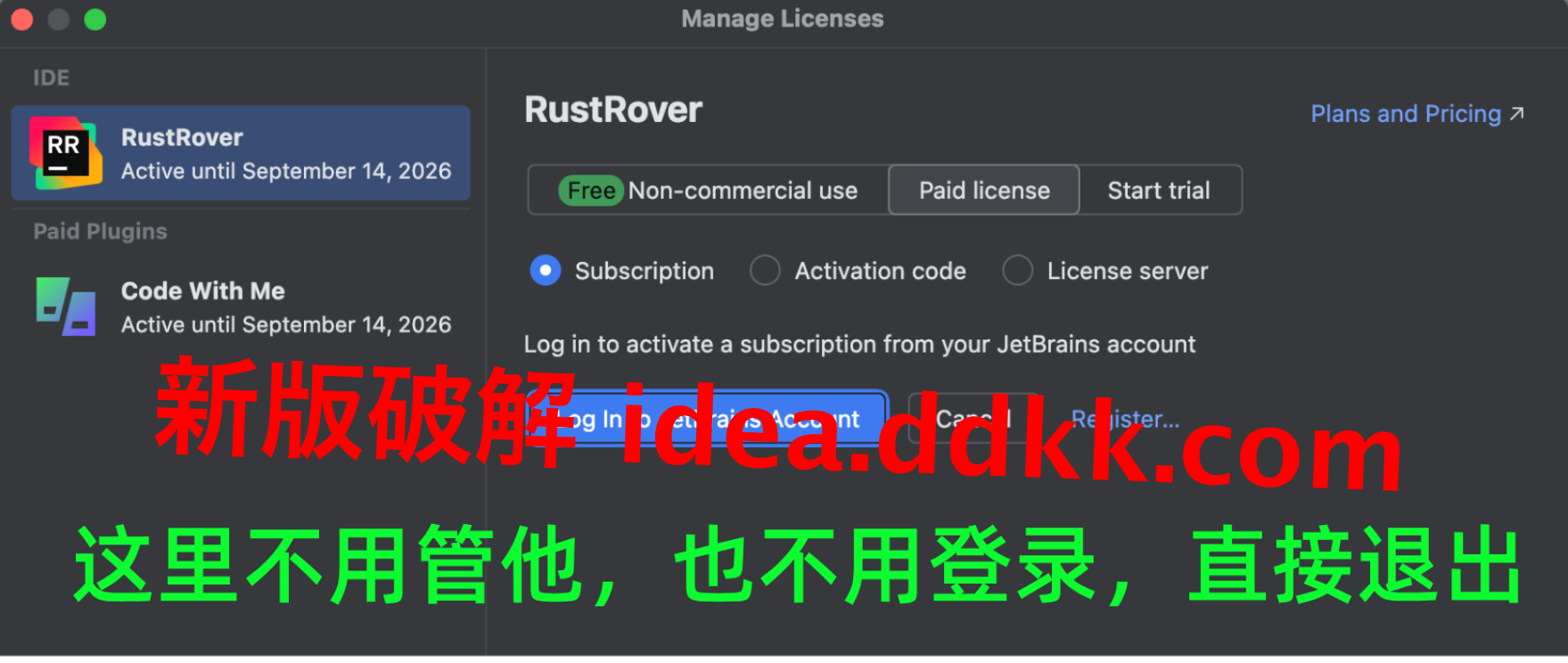 RustRover 装完噔一开,十有八九给你弹个大面板让你登录 JetBrains 账号——这时候你心里跟猫挠似的我也知道,手指头往「Login」上移了是吧?压住。现在登了后头补丁链路容易绕晕,听我一句,先做 Exit,把门关上咱再开锁。