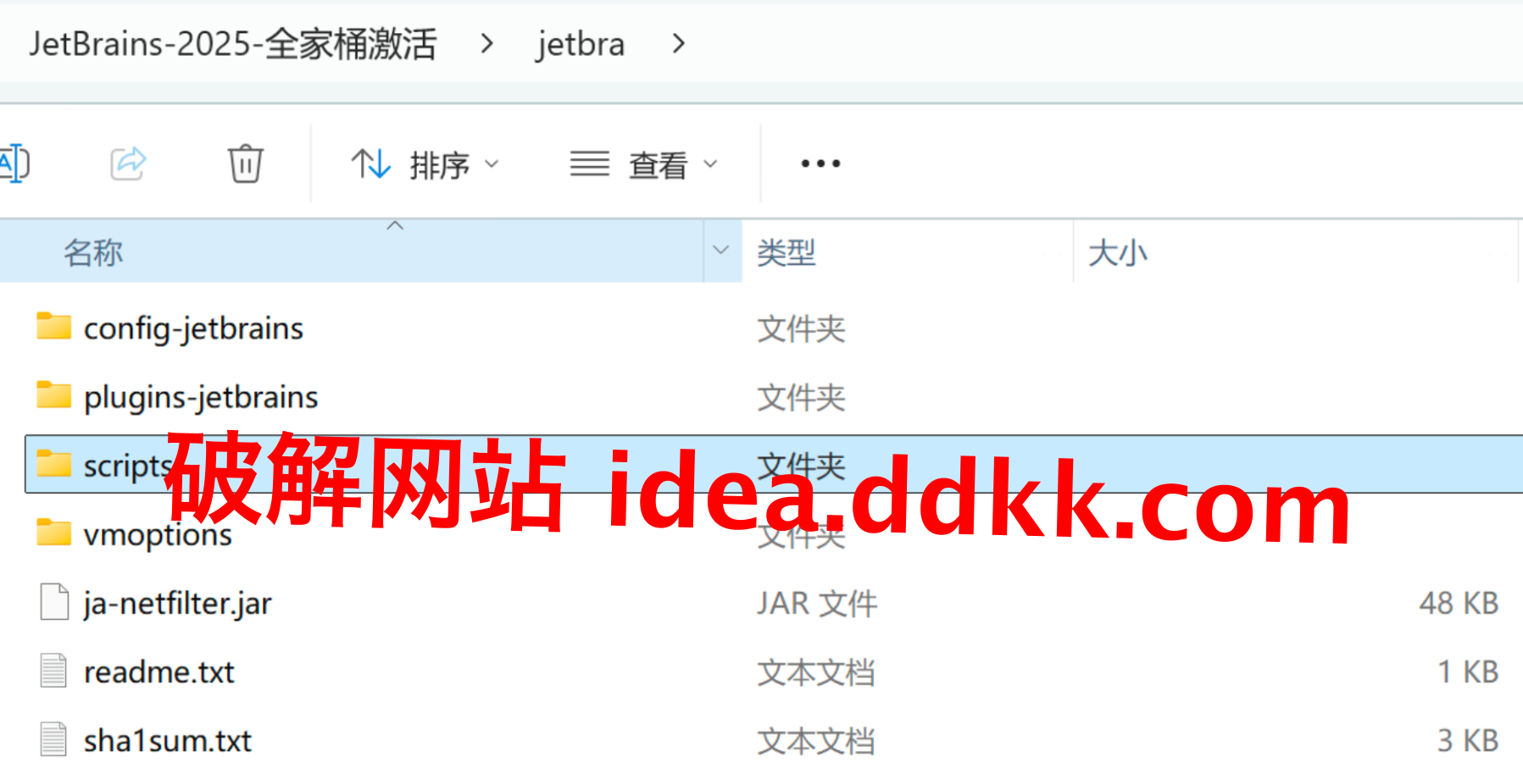 补丁包从文末尾链拿齐活再往下读,别半截开搞。解压完目录取个顺眼的英文名,里头大致分:scripts 一卷,各种 install/uninstall 按 Win、Mac、Linux 分好了;自动化那一套会把 rustrover.vmoptions 一类文件里挂上补丁引用,手残党贼友好,省你自个去抠路径。